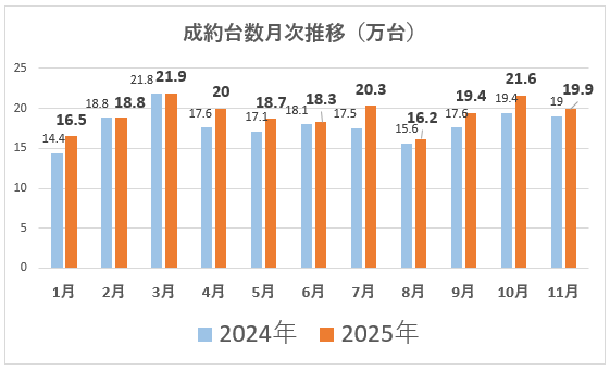 中古車オークション大手「ユー・エス・エス」において、直近2025年11月の平均取引価格(成約車両単価)は129.7万円と、前年11月の118.4万円から約10%上回り相場の高騰が継続しています。取引台数(成約台数)でも前年比104.4%と増加しており、中古車売買が活性化しています。
