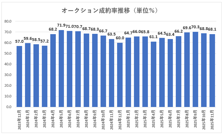 また、オークション全体の成約率についても、下記表のように2023年末頃は60%前後で推移していたものが、2024年4月以降70%前後と上昇傾向にあります。