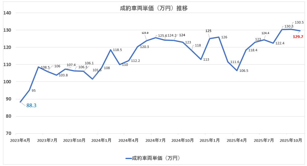 中古車オークション運営大手「ユー・エス・エス」によると、オークションの成約車両単価は、下記表のように2025年11月には約130万円と高騰しており、前年比でも109.6%と高値で推移しています。