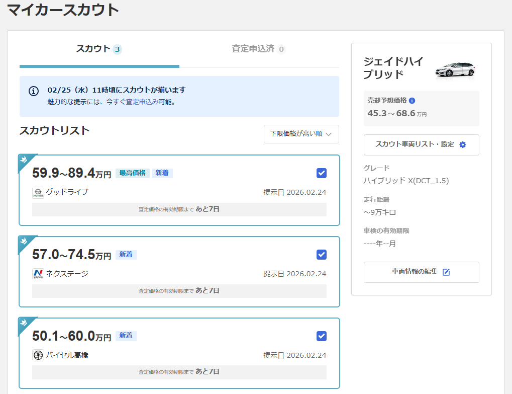 実際に筆者の所有する車(ジェイドハイブリッド2016年式8万キロ)を登録し、査定額提示を依頼したところ、登録後約1時間で下記3社からの概算提示がありました。