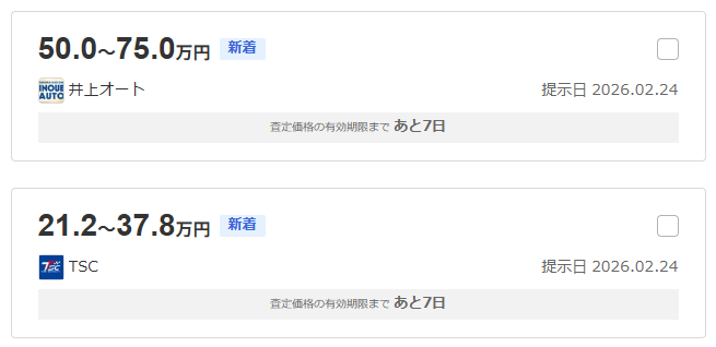マイカースカウトで連絡がきた3社以外にも、追加(12時間以内)で2社提示があり、それぞれ50~75万円、21.2~37.8万円というかなりの差異がありましたが、実際よりも高値を提示するところがほとんど(5社中4社)でした。